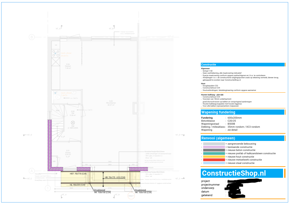 Een constructietekening is de technische uitwerking van de dragende delen van uw verbouwing. De constructeur berekent eerst volgens de Eurocodes welke belastingen optreden. Hierbij worden permanente belastingen, zoals eigen gewicht van vloeren en daken, gecombineerd met veranderlijke belastingen zoals gebruiksbelasting, sneeuw en wind.